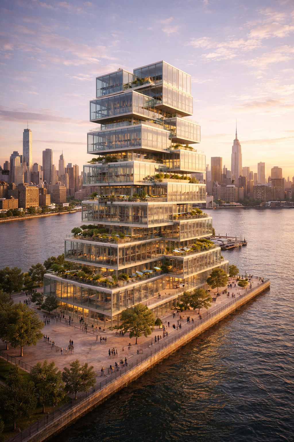 A built interpretation of those principles, translating natural layering and transparency into an urban architectural form.