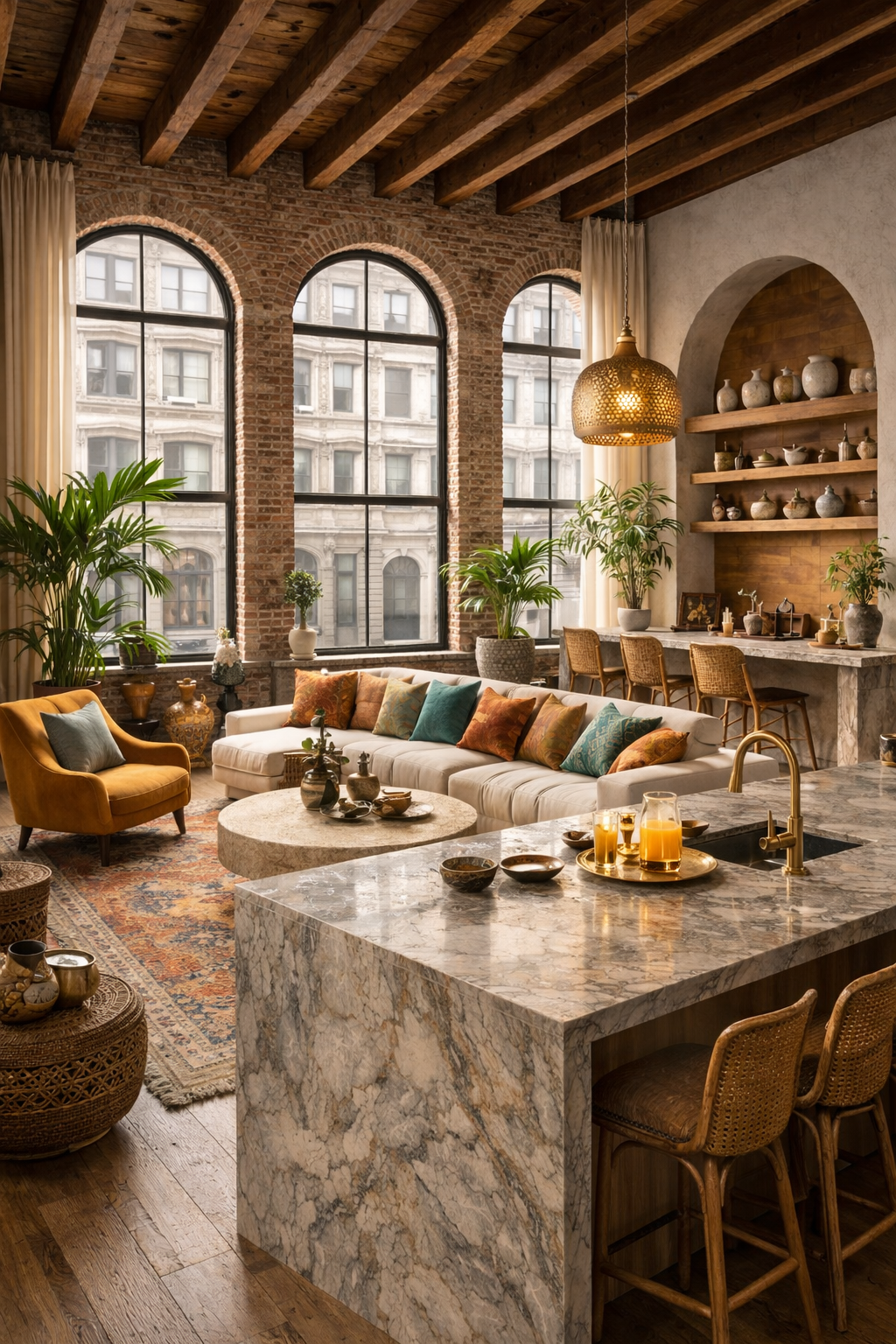 Open, light-filled living space where exposed brick, arched windows, and natural materials come together, creating a warm, social atmosphere enriched with handcrafted details and soft, earthy tones.